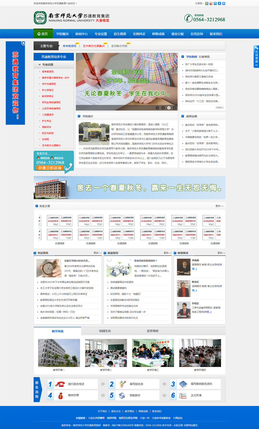 南京師范大學蘇通教育集團六安校區在江淮地區是獨家融入江蘇先進教學理念和安徽教學管理模式相結合,不公開的試卷、教參等保密教學資源,提升本科的教學效果,成功實踐的教學內容。彰顯安徽全國高考模式的特色模范復讀學校。我校任課老師教學水平首屈一指且指教多年高三畢業班的文理泰斗、名校一線精英攜手組建的高復名師團隊,是一所專門從事高考復習工作的合法的全日制辦學單位。