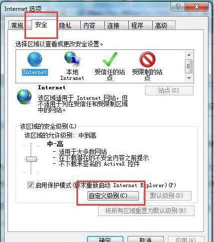 2、點擊“安全”進入“Internet”點擊“自定義級別”。如圖所示: