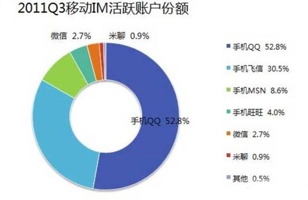 這是2011年第三季度移動應用市場份額圖,當時騰訊的微信、小米的米聊才剛剛推出,而飛信經過四年的跑馬圈地,已經占據了幾乎三分之一的市場,排在它前面的只有手機QQ,這兩家占據了超過八成的市場份額,當時微信和米聊跟它都不是一個量級,而電信的易信要再等兩年才會出現。事實上,這也是飛信所能達到的極限了,因為中國移動內部一直對飛信采取打壓發(fā)展的策略,畢竟短信電話賺錢太容易,何必費勁搞個吃力不討好的飛信?所以飛信雖然是移動的嫡長子,其實是個庶出的命。更重要的一點,中國移動也搞不清楚飛信以后要怎么發(fā)展,所以前期一直沒有對電信和聯通的用戶開放,大大錯失了一統天下的好機會,好比項羽在鴻門宴時放走了劉邦,等回過頭來的時候,就只有自刎烏江了。