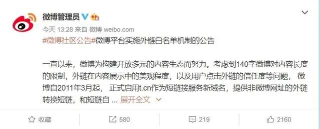 新浪微博宣布要實施外鏈限制,以后外鏈跳轉僅對部分網站開放,白名單以外的網站不再支持短網址跳轉,微博要對外鏈跳轉下手了!