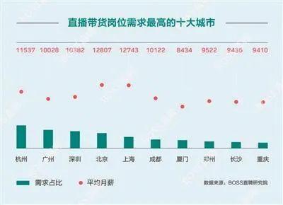 BOSS直聘研究院做過一個報告:在一線城市,直播帶貨主播的月薪普遍比較高。杭州平均月薪能達到11537元,廣州平均月薪10028元,深圳平均10382元。
