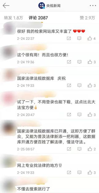 有網友直呼這是“法律檢索網站的國家隊來了” “大大方便了普通人對法律法規的檢索需求”,還有網友感慨,“這個數據庫太逆天了” “終于不用去某法寶上花錢看最新、最準確的法律內容了”。