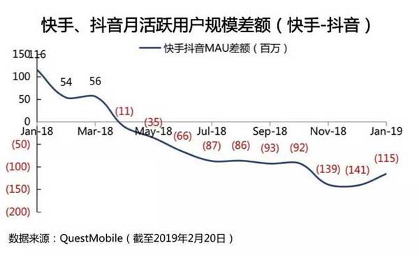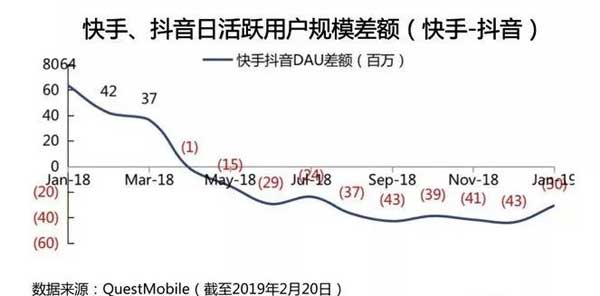 截止2019年1月19日,二者的日活差距縮小為3000萬。