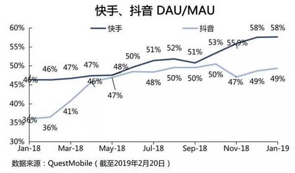 DAU/MAU可以反映出用戶粘性,從數據可見,快手的DAU/MAU一直高于抖音,并在2018年11月之后逐步擴大,可見快手的用戶粘性高于抖音,快手用戶對平臺的忠誠度更高。