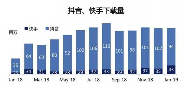 下載量方面,從體量而言,抖音遠遠大于快手。在2018年1月至2019年1月期間,抖音單月最高下載量為11600萬,快手最高為4300萬。