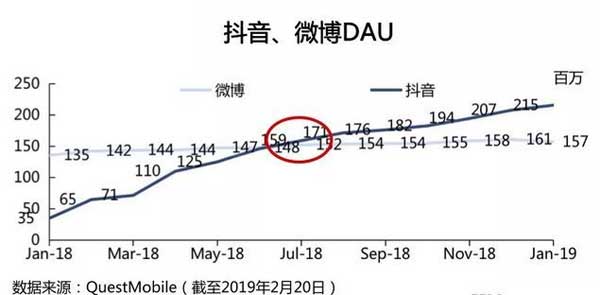 此外,抖音與微博的數據也進行了對比。數據顯示,抖音的日活、月活已經超過微博,而且差距還在逐漸擴大。
