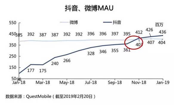 2018年7月,抖音日活為1.59億,首次超過微博(1.48億),隨后二者的日活差距不斷擴大;2018年11月,抖音月活為4.12億,首次超過微博(4.03億)。自此,“兩微一抖”的格局真正形成,抖音成為新的國民APP。