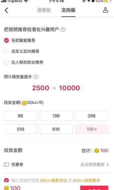 咋一看好像沒有什么大問題,但是抖音DOU+投放100元最少可以獲得2500的曝光,最少只要4w就可以實現200w真實曝光,對方凈賺2w元。