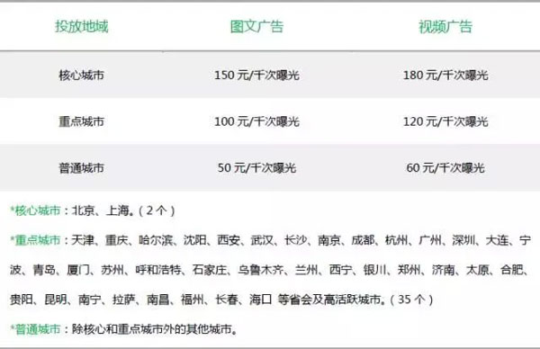 2、重點城市:每千次曝光收費圖文廣告為100元,視頻廣告為120元