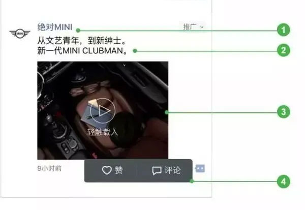 朋友圈視頻廣告由四個部分的內容構成,包含廣告主頭像&名稱、外層文案、外層小視頻、用戶社交互動等。