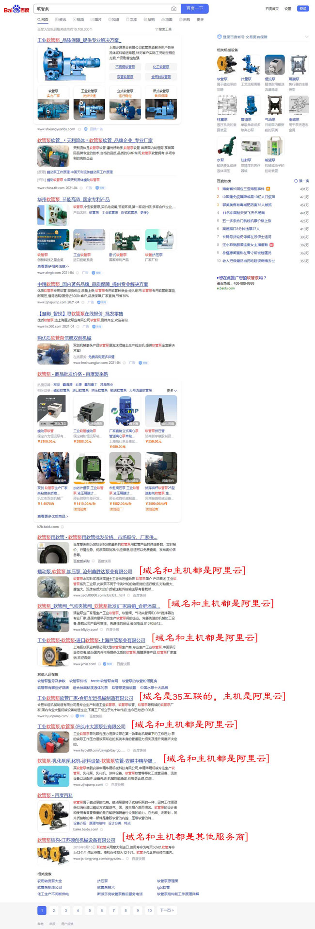 百度搜索關(guān)鍵詞“軟管泵”,我們通過站長工具發(fā)現(xiàn)排名首頁的有7家企業(yè),其中前6家公司產(chǎn)品用的都是阿里云的,是否可以說明阿里云的產(chǎn)品更有利于關(guān)鍵詞排名?當然阿里云購買產(chǎn)品一定要在網(wǎng)絡(luò)公司技術(shù)人員專業(yè)指導下購買,否者會造成不必要的浪費。