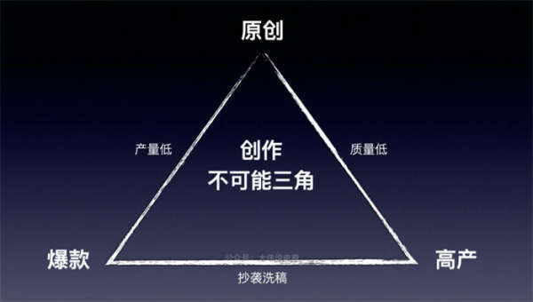 比如任何一個行業、垂類能講出花樣的內容或選題,可能就那么多,總有消耗完的一天,創作者不得不“借鑒”其它爆款。即使你真的高產如母豬(背后有幾百人的智囊團隊),但,你能保證每一個作品都能成為爆款嗎?這就是內容創作的一個不可能三角模型:原創、爆款、高產。