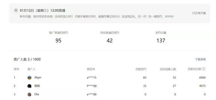 去年12月,視頻號(hào)上線了直播預(yù)約推廣功能,一場(chǎng)直播可以綁定 1000 個(gè)推廣人。簡(jiǎn)單來說,用戶可以通過掃碼綁定成為直播推廣人,在視頻號(hào)后臺(tái)也可以直接查看一場(chǎng)直播中,推廣人帶來的預(yù)約觀眾數(shù)、受邀人在直播間的交易金額。