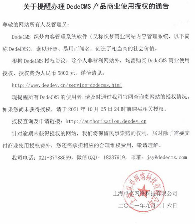 昨晚dedecms(織夢)發布公告:除個人非盈利網站外,均需要購買DedeCMS商業使用授權,授權費為5800元。針對逾期未獲得授權的網站,我們將保留民事索賠權利,屆時除了需需要支付商業使用授權費外,您還需承擔相應的合理維權費用。
