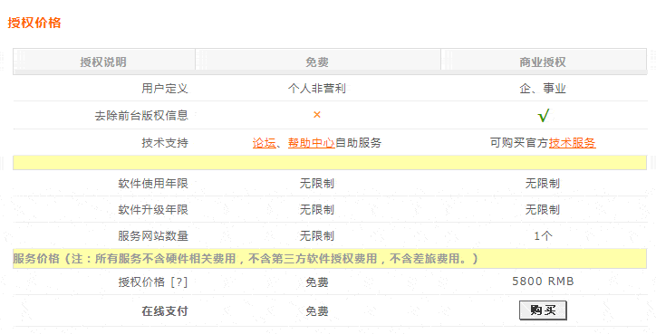 同時,我們在其官網上也看到了收費明細,商業授權5800元,僅能使用一個網站,而一定要注意“個人非盈利”。