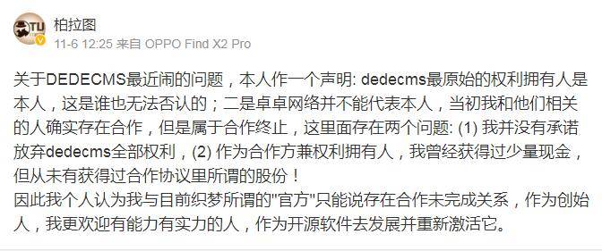在之后,DEDECMSv6開發團隊授權人柏拉圖出來發聲表示說:DEDECMS最原始的權利擁有人是自己,當初只是跟卓卓網絡合作,現在合作終止了,他們代表不了自己,并且織夢DEDECMS所有著作權也是自己的,作為創始人, (1)我并沒有承諾放棄DEDECMS全部權利,(2) 作為合作方兼權利擁有人,我曾經獲得過少量現金,但從未有獲得過合作協議里所謂的股份!