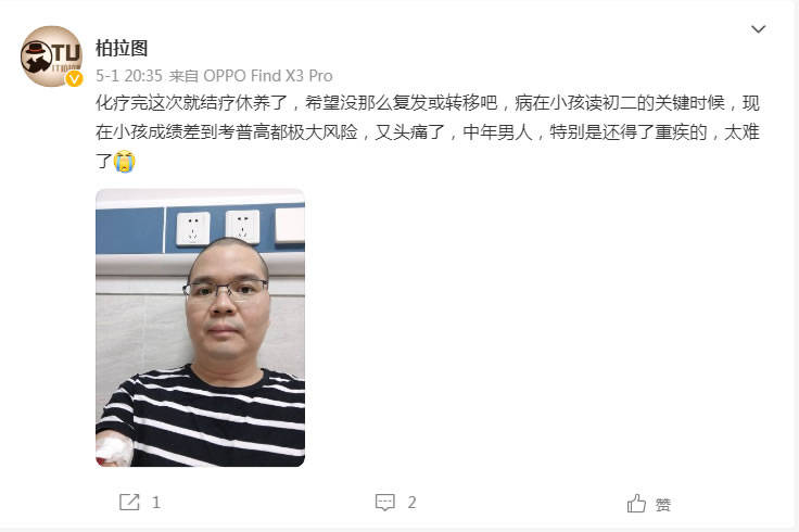 柏拉圖在微博里說到:化療完這次就結療休養了,希望沒那么復發或轉移吧,病在小孩讀初二的關鍵時候,現在小孩成績差到考普高都極大風險,又頭痛了,中年男人,特別是還得了重疾的,太難了。