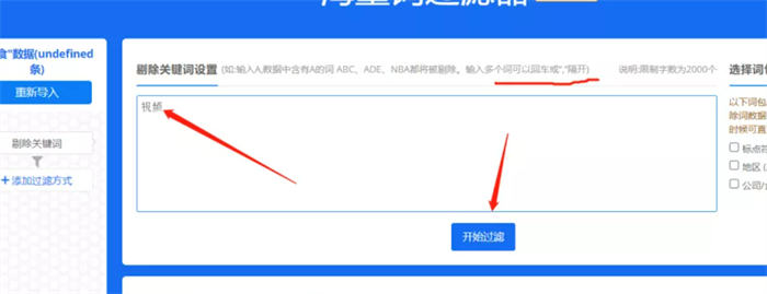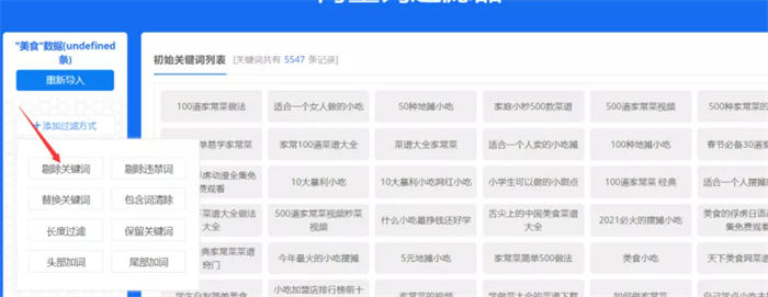 過濾掉一些你不要的詞語,比如我這批美食標題里面,有一些是帶有「視頻」的標題,我不需要這樣的標題,我就可以輸入「視頻」兩個字,就可以過濾掉全部帶有「視頻」兩個字的標題。