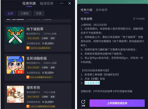 2、在任務列表中,找到感興趣的游戲,游戲分為小游戲和手游兩大類,點擊進入詳情頁,認真閱讀任務的介紹說明。