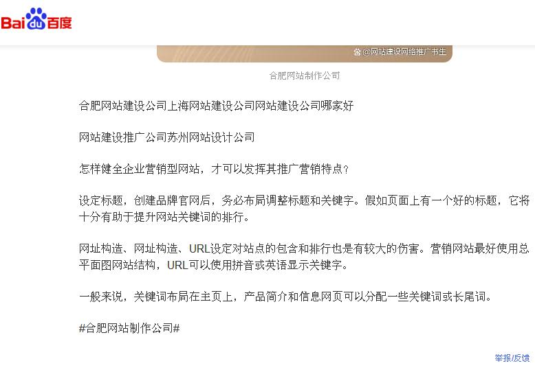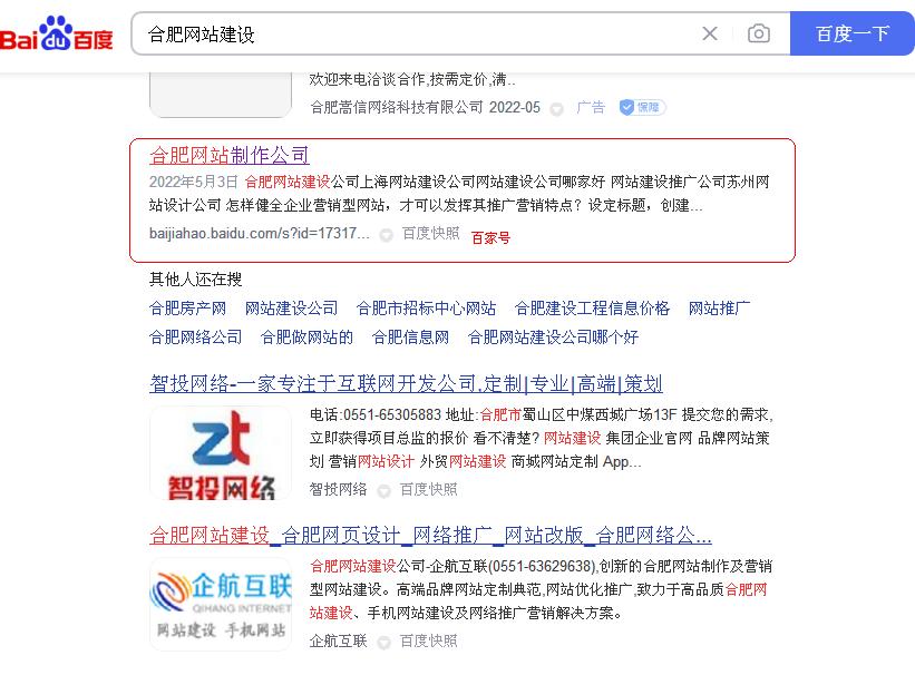 2022年了,5月份發現百家號開始雄起了!剛剛百度“合肥網站建設”這個關鍵詞,首頁居然出現了百家號,如下圖: