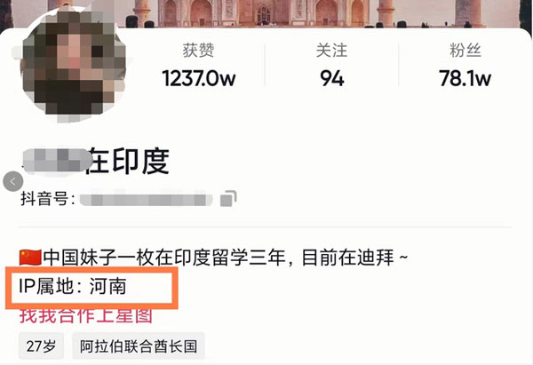 此前自稱“在印度留學(xué)常駐”的某博主,顯示IP地址為河南后,將簡(jiǎn)介修改為“在印度留學(xué)三年,目前在迪拜”。目前,其IP地址顯示為阿聯(lián)酋,但在另一個(gè)平臺(tái)上這位網(wǎng)紅博主的IP地址依然是河南。