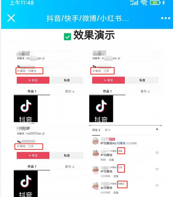 記者向一位打出“五皇冠企業(yè)店鋪 IP快穩(wěn)全”廣告的商家咨詢,希望修改抖音等IP屬地后,客服給來(lái)一個(gè)QQ號(hào)。成功添加后,上述商家向記者發(fā)來(lái)一個(gè)鏈接,里面是對(duì)不同平臺(tái)的收費(fèi)標(biāo)準(zhǔn),更改IP后同一個(gè)抖音賬號(hào)在內(nèi)蒙古、江蘇等不同城市的“效果展示”以及操作流程。