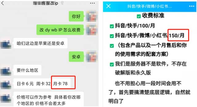 在價(jià)格方面,低至6元,就能實(shí)現(xiàn)比火箭還快,個(gè)人賬號(hào)想去哪兒都行的“IP自由”。記者在添加了電商平臺(tái)的一位商家微信后,進(jìn)行了詳細(xì)了解,選擇了8元/日、可同時(shí)修改多個(gè)平臺(tái)IP地址的服務(wù)器。“不是太復(fù)雜,包教的。”商家表示。