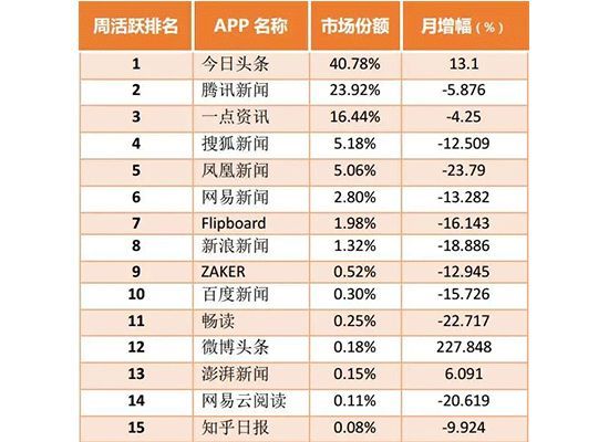 隨著移動互聯網的迅猛發展,網友在閱讀習慣上也在逐步發生著改變,從早前的PC端逐步向手機、平板燈構建的移動端轉化,因此手機上的APP軟件逐步走紅,日前根據獵豹全球智庫發布的最新一期新聞類APP排名顯示,今日頭條穩居排名第一,騰訊新聞、一點資訊緊隨其后排名第二第三。