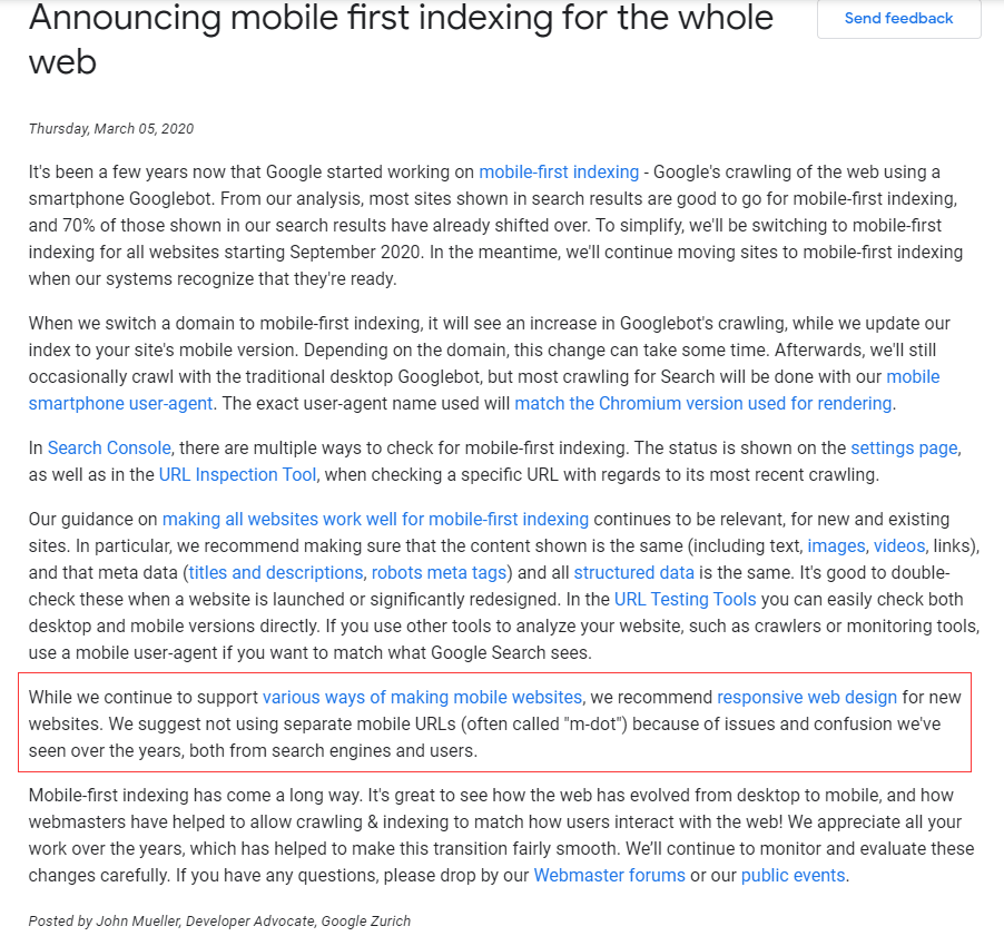 實際上,早在2018年8月,谷歌就明確建議在網站建設中使用響應式自適應技術,并提出了6個理由: