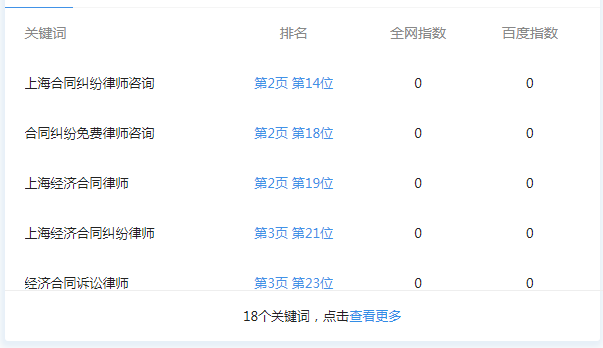 網(wǎng)站上線2個月,網(wǎng)站關(guān)鍵詞:上海經(jīng)濟律師,上海合同糾紛律師,上海借款糾紛律師,上海經(jīng)濟合同律師,上海合同訴訟律師,上海經(jīng)濟訴訟律師......排名百度前三首頁。新站上線三個月的考察期馬上就要走完了,非常期待后期的排名!