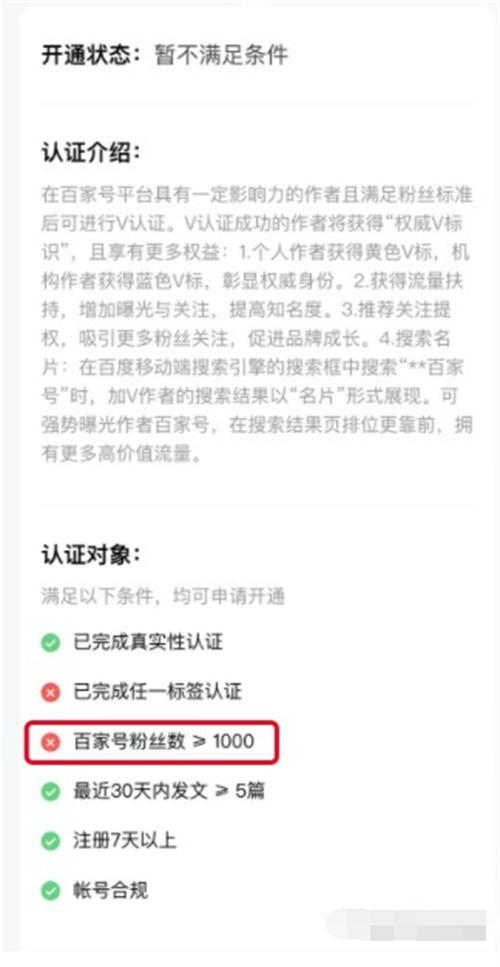 比如上圖是我教程百家號認證提示,要滿足1000粉絲(當然,前面百家號站外優化說過有人+粉之類,哈哈哈)。所以,我就不用賬號參與排名,主要做百家號文章排名。