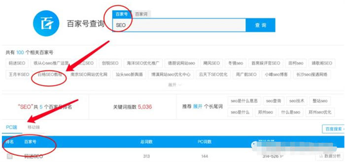 百家號SEO主要優化兩個排名:一個是優化百家號賬號名稱靠前,一個是優化百家號文章關鍵詞排名靠前。如圖: