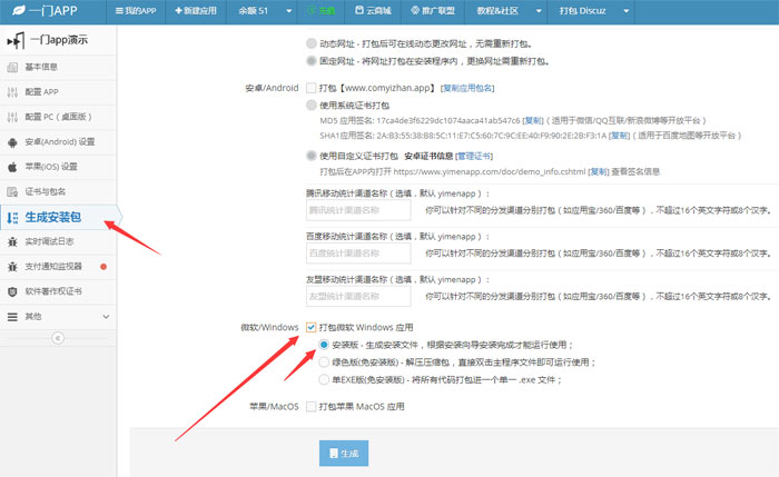 2、在左側(cè)生成安裝包頁面,一鍵生成EXE安裝包