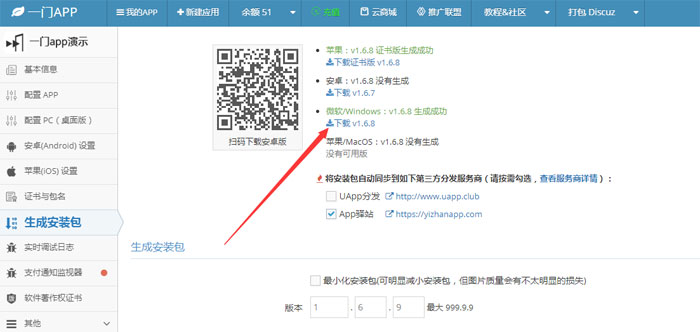 3、在生成安裝包頁面頂部,獲取下載EXE安裝包文件