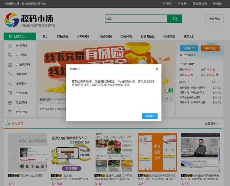 A5的源碼市場(chǎng)關(guān)站,這是一個(gè)與源碼交易為主的平臺(tái),主要是賣一些網(wǎng)站模板、源代碼的。不過(guò)這個(gè)平臺(tái)這么多年做的一直不溫不火,也許是免費(fèi)的、盜版的源碼太多了,站長(zhǎng)也太摳了,正經(jīng)的源碼交易都做不起來(lái)。