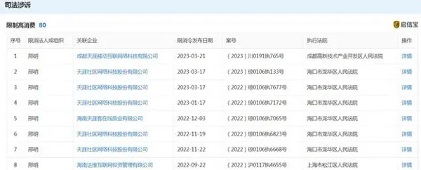 與此同時(shí),據(jù)風(fēng)險(xiǎn)信息顯示,天涯目前累計(jì)被執(zhí)行金額已超 4.6 億元,相關(guān)法人和創(chuàng)始人已經(jīng)被限制高消費(fèi)。