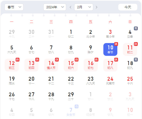 2024年2月6日(農歷臘月二十七)至2024年2月17日(農歷正月初八),共十二天,2024年2月18日(農歷正月初九)正式上班。