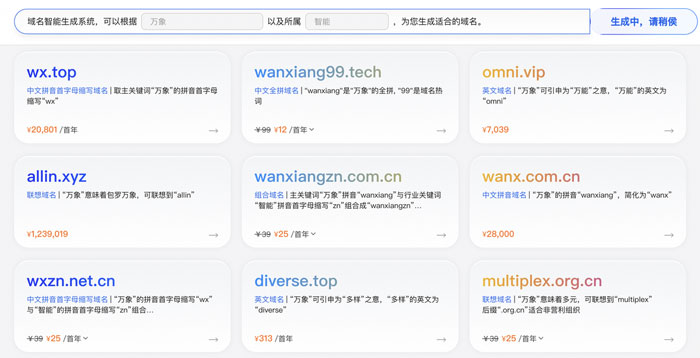 升級后的阿里云萬網(wǎng),用戶只需輸入品牌名稱和所屬行業(yè),基于通義大模型就能批量生成創(chuàng)意域名,并自動完成可用性篩查,輸出域名含義。隨著域名注冊量的增長,簡短易記的域名變得難以獲得,據(jù)統(tǒng)計,找到一個滿意的域名平均需要查詢50次以上,而智能起名應(yīng)用則能一鍵完成這一過程,使域名注冊從“拼腦力”進(jìn)入“拼算力”時代。
